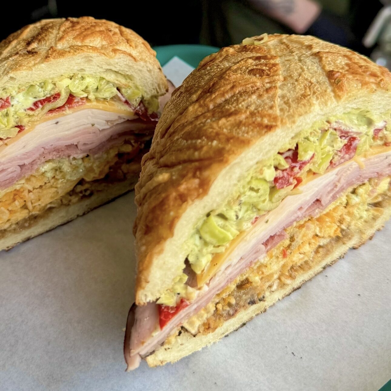 A GIANT toasted parmesan garlic sub roll stuffed with house sliced Black Forest ham, turkey AND roast beef, Tillamook cheddar cheese, crushed cheddar Ruffles chips, our caramelized onion sauce, pesto aioli & pickled peppers…20