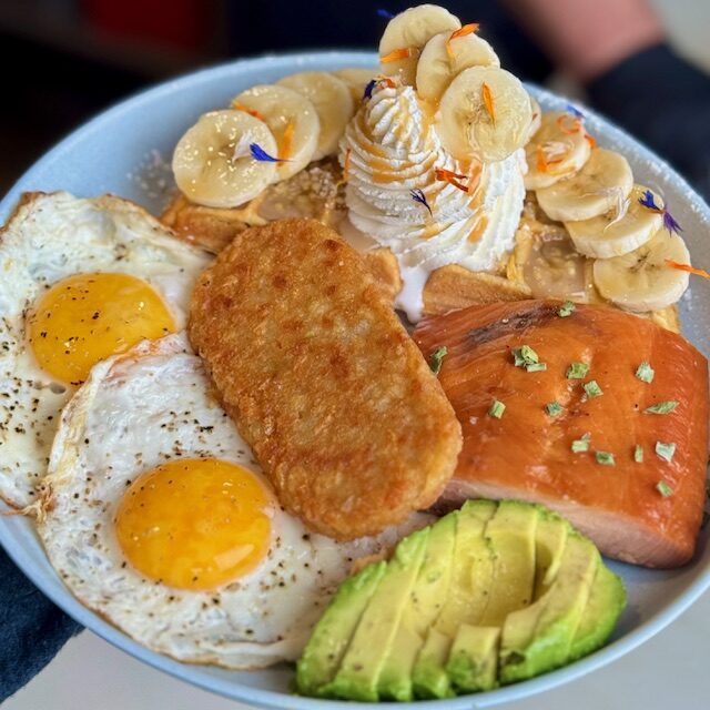 1/2 Plain waffle, 1/2 Specialty waffle (+$5 – Apple, strawberry or banana), Toast (Brioche, whole wheat or sourdough)