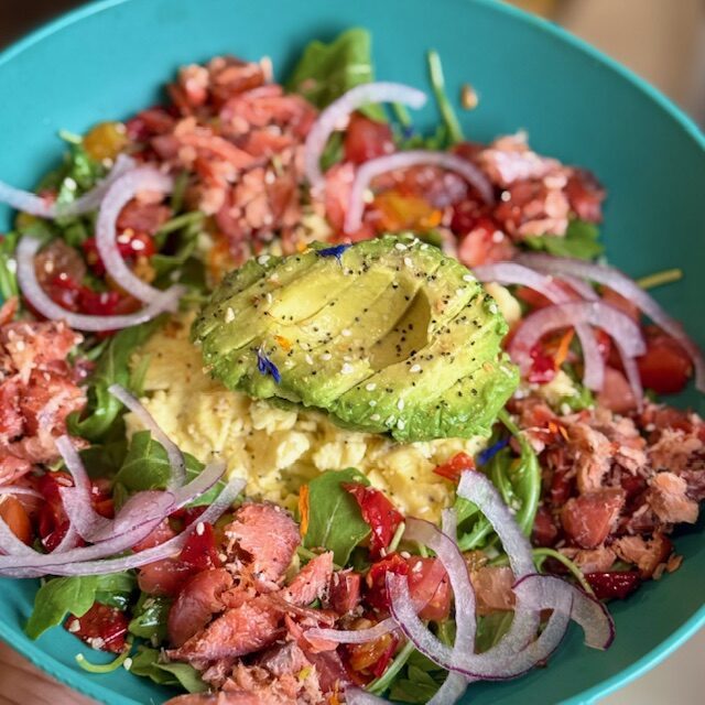 A scrambled egg bowl topped with our zesty lemon basil sauce, arugula, diced tomatoes & pickled peppers, thinly sliced red onion, Hungarian pepper vinaigrette (lightly spicy), everything seasoning and your choice of protein: fresh avocado, diced bacon, diced sausage, diced veggie sausage or local smoked salmon chunks…16