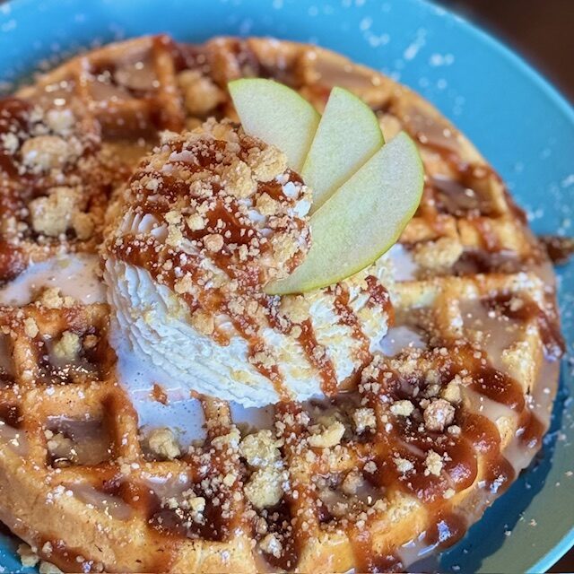 Vanilla waffles topped with maple cream sauce*, caramel apple sauce, shortbread cookie crumble & vanilla whipped cream. 100% made in house from scratch!…16